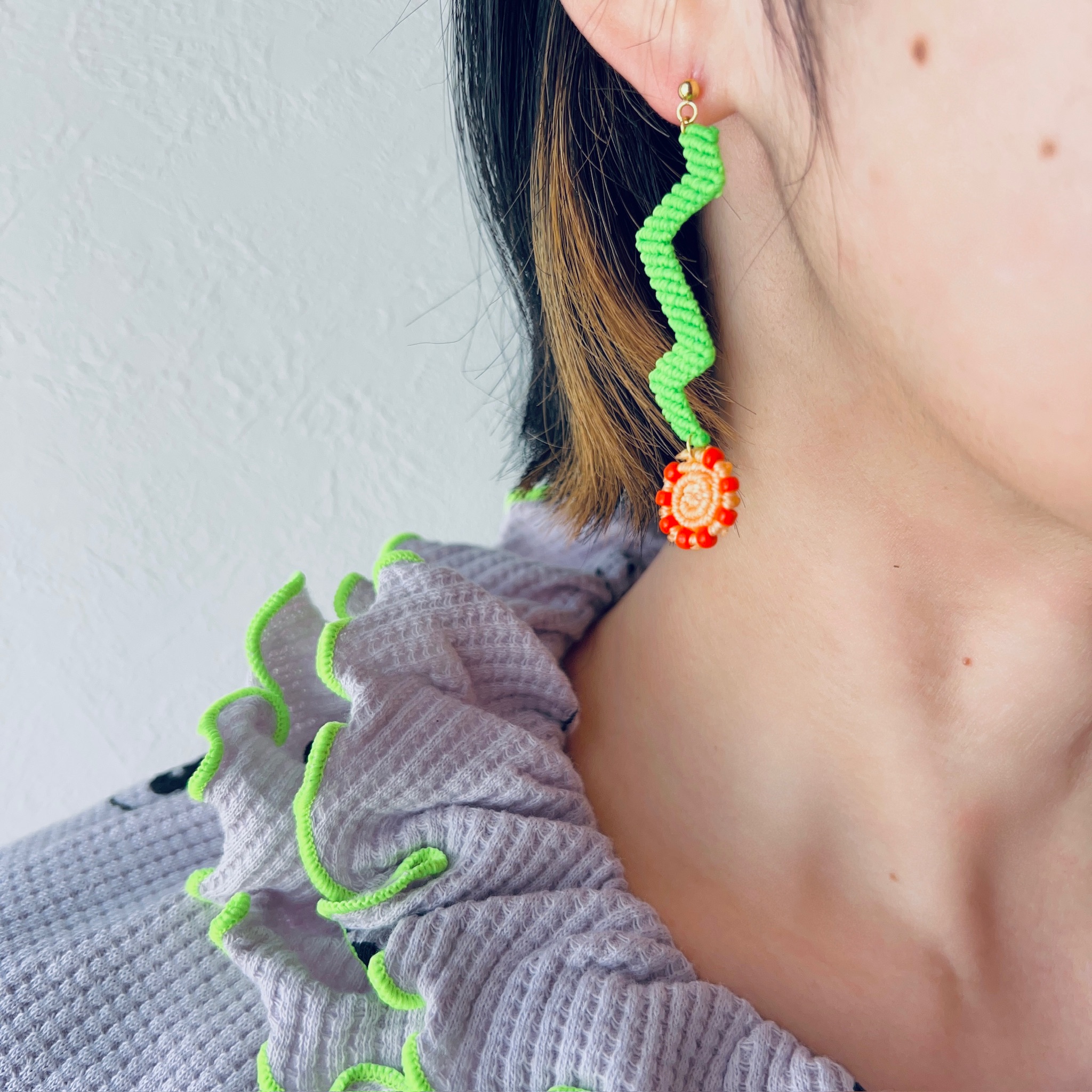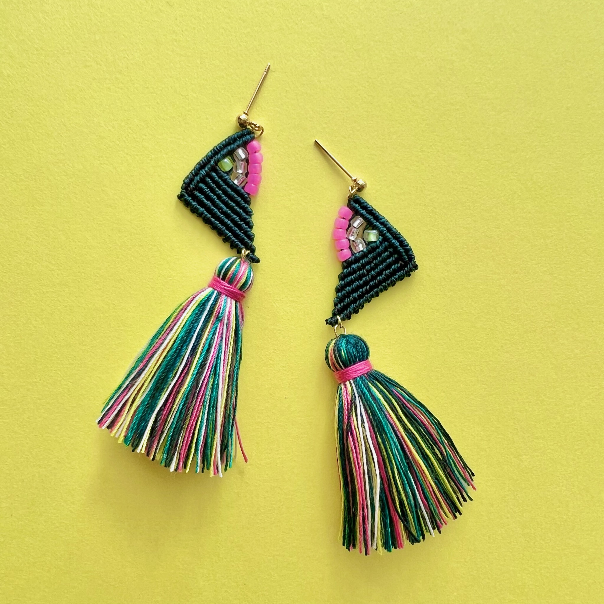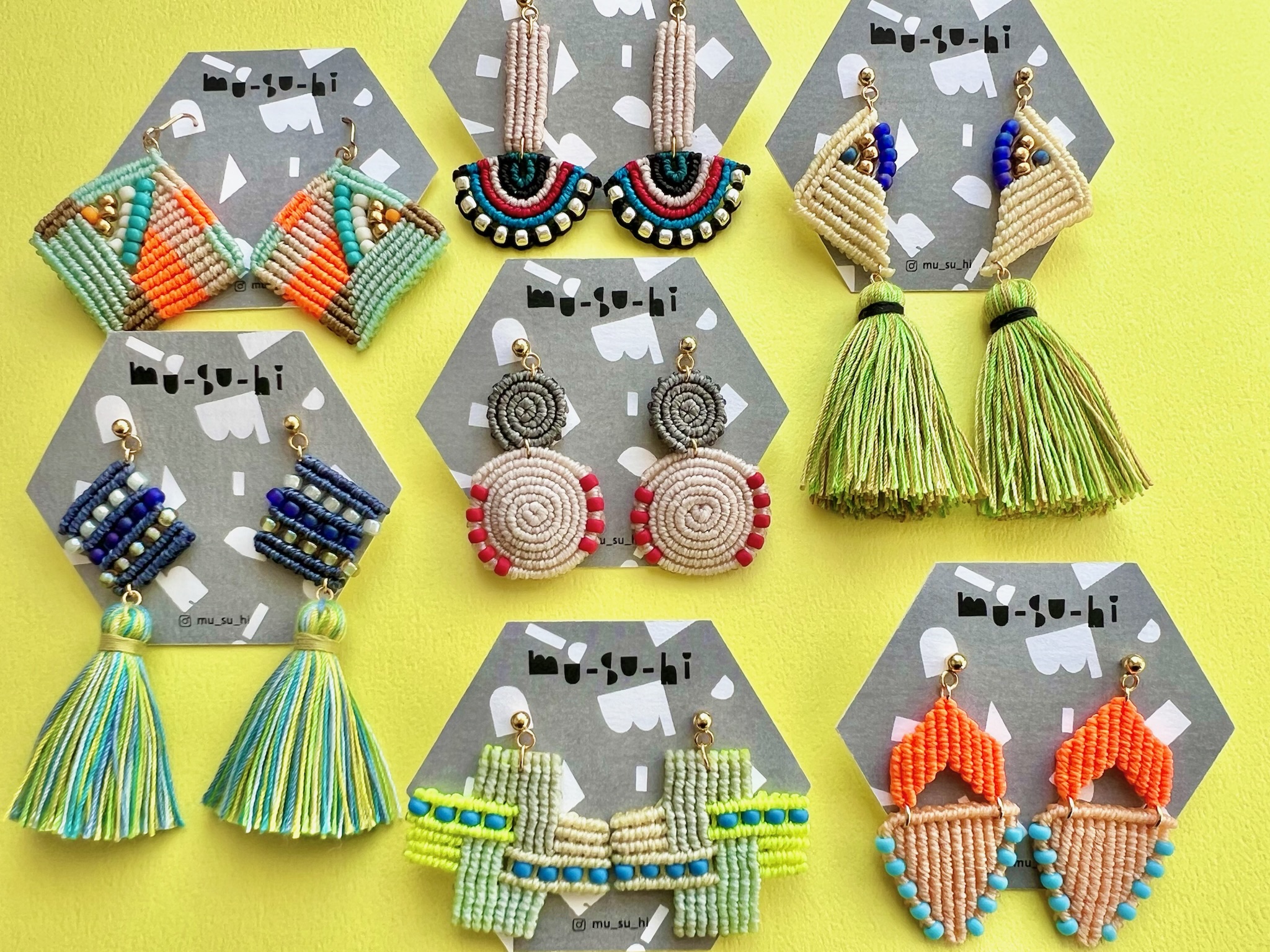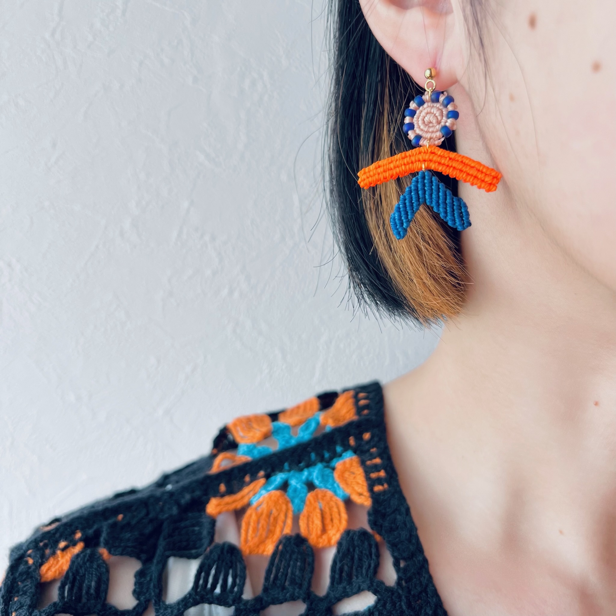 糸とビーズを組み合わせたマクラメ編みのアクセサリーを一つ一つ手編みで製作しています。