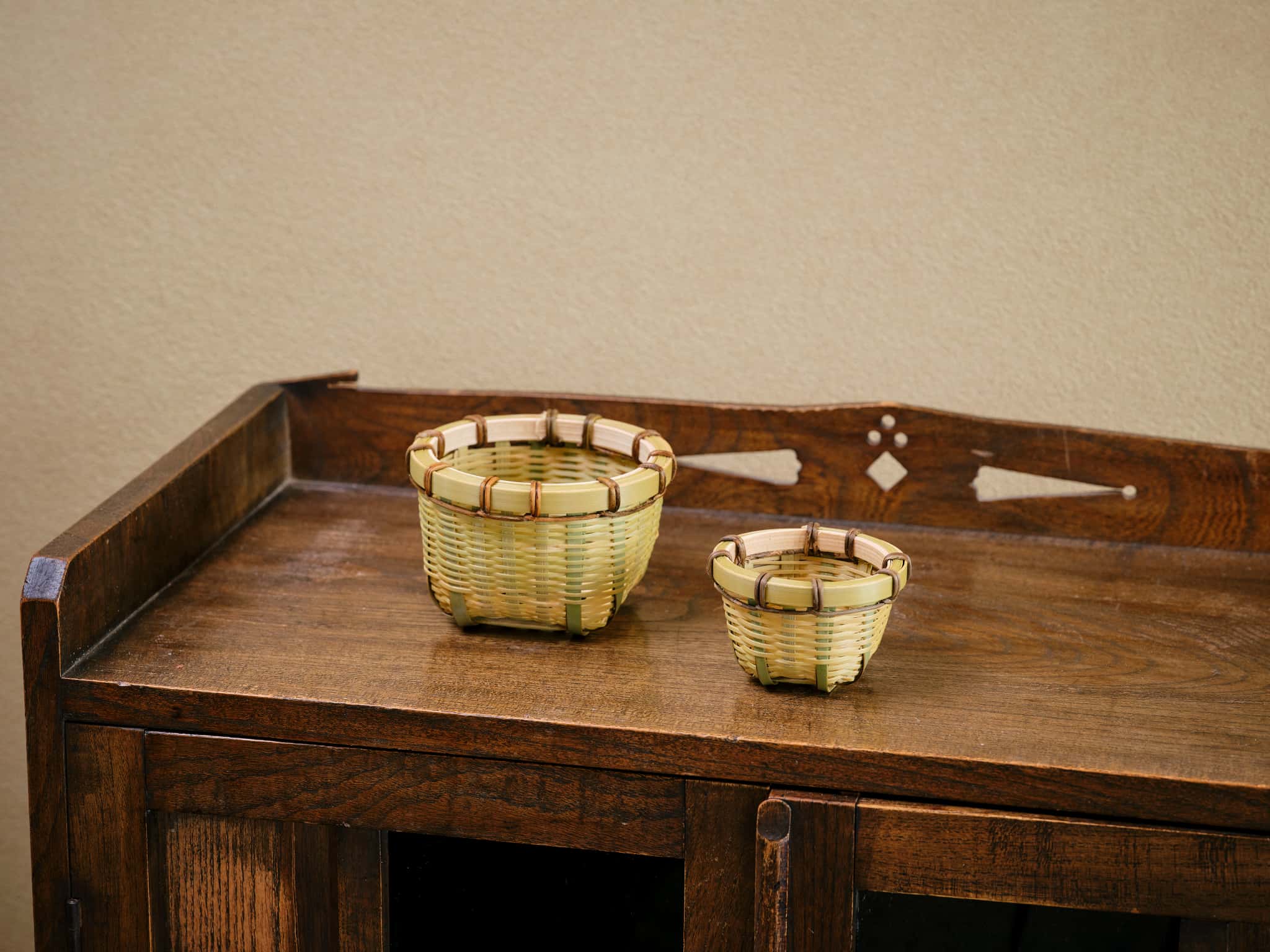 当工房の主力製品である青竹の籠は、使い込むほどにツヤのある飴色へと経年変化していきます。竹林で厳選した竹から製作していますので、末永くお使い頂けます。