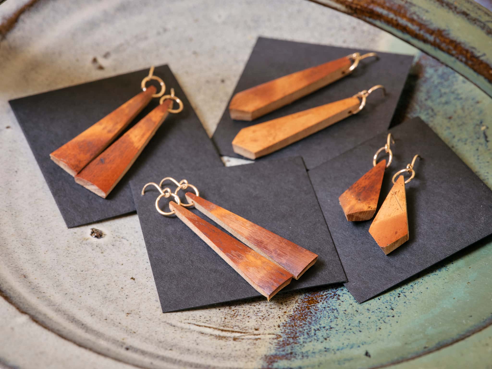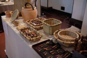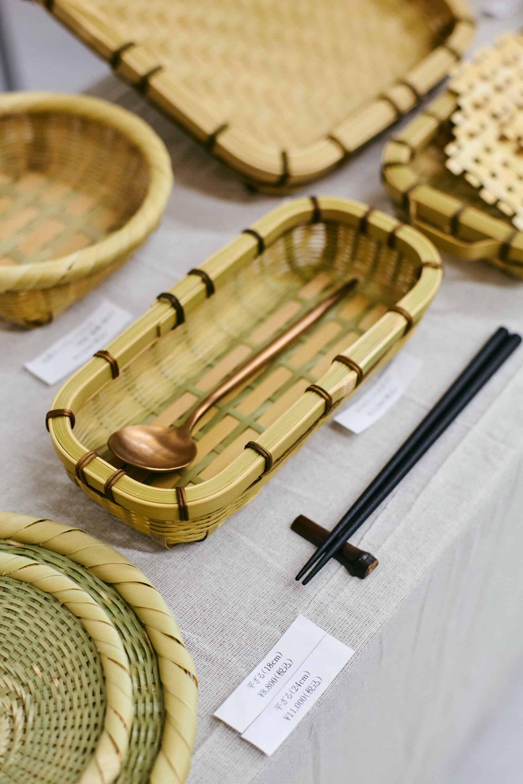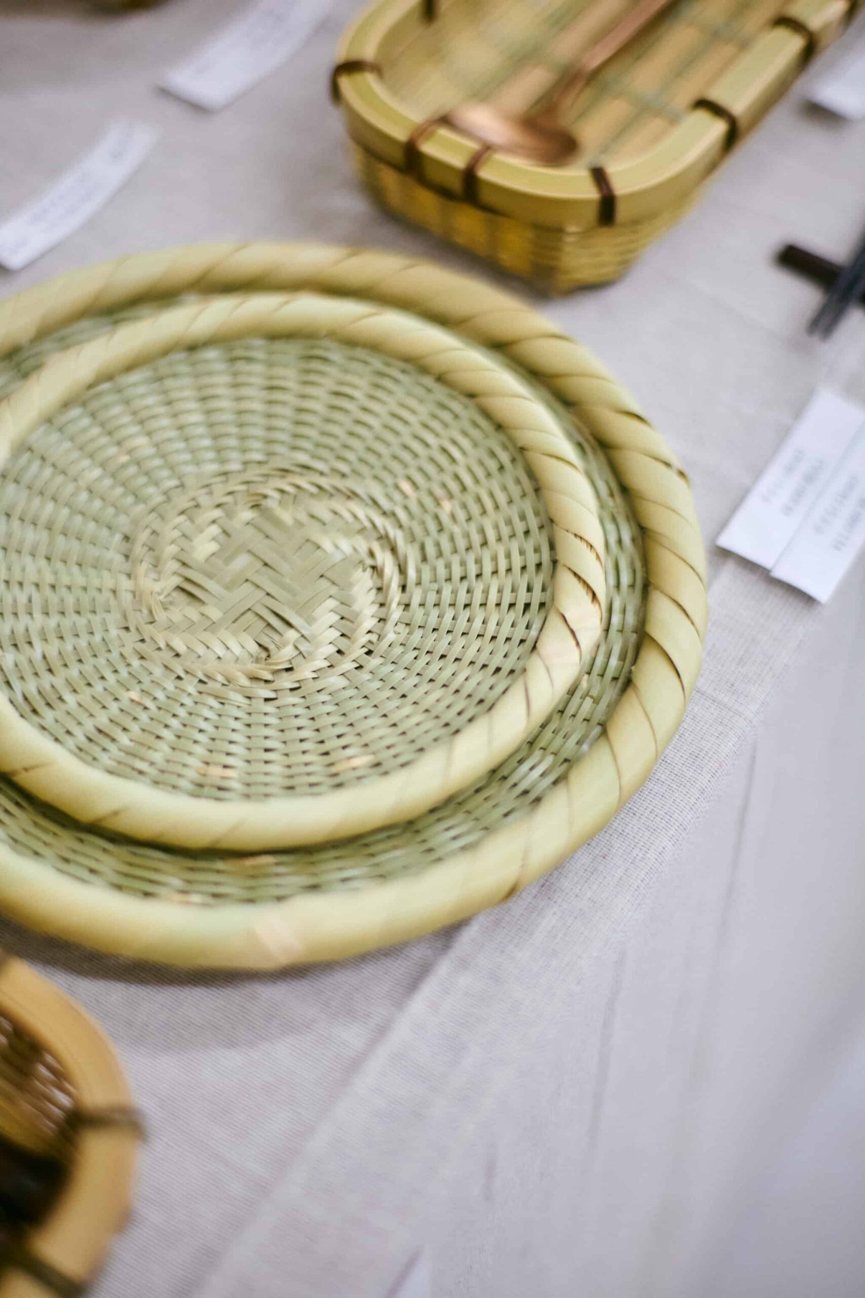 当日は、「竹をつかう」という選択肢を皆さまに実感して頂けるよう、籠やざるなどのテーブルウェアのほか、古民家から取り出された100年ものの煤竹を使用したピアス、箸置やコースターなどのカトラリーを展示販売いたします。