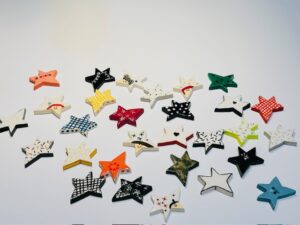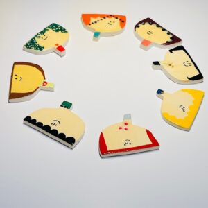 ひとつひとつ手描きで作っています。カラフルなものや、シンプルなもの、いろんなパターンで重ね付けを楽しめるブローチです。