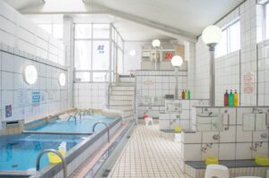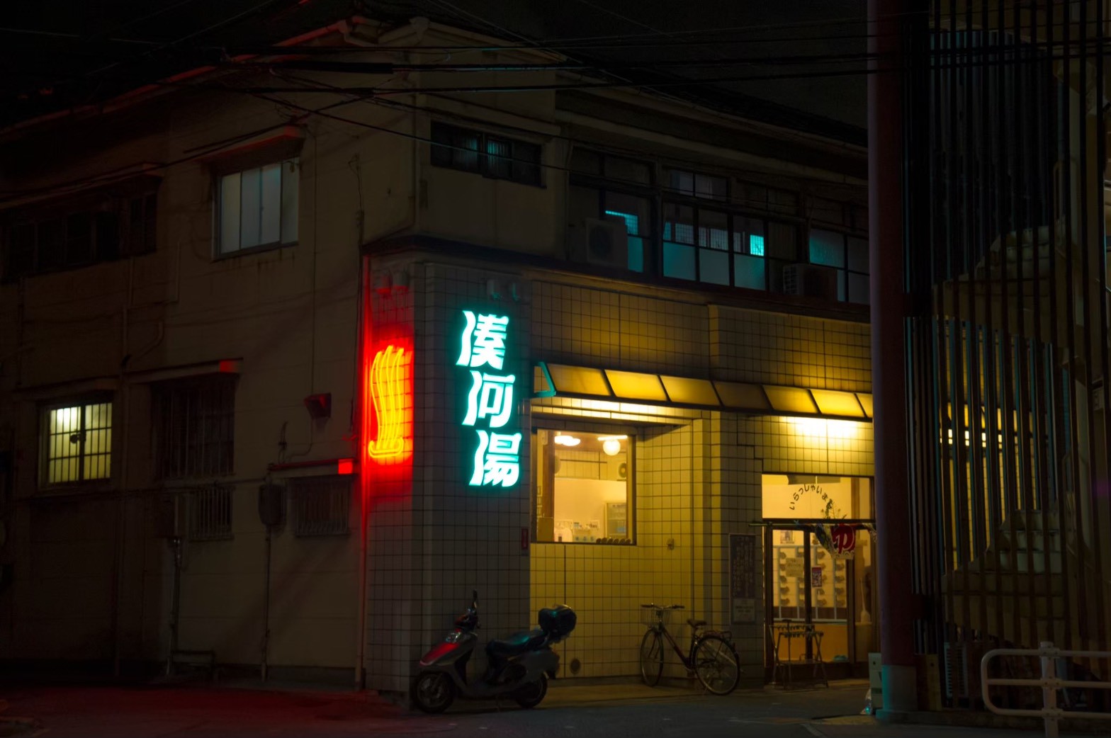 東山商店街のすぐそばにある銭湯 湊河湯です。大通り沿いにある大きな”湊河湯ネオン”が目印。